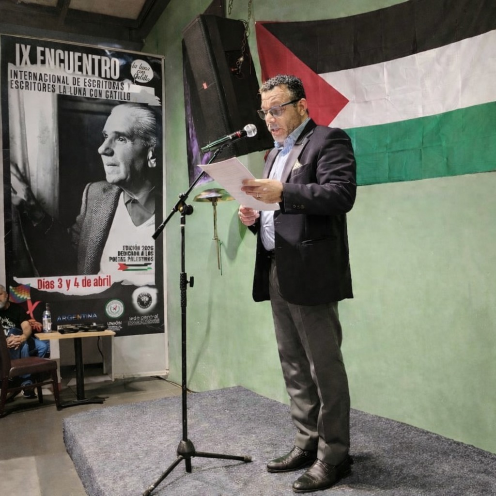 Por su parte, el embajador Riyad Al-Halabi, encargado de negocios de la Embajada del Estado de Palestina en Argentina, destacó en su intervención el simbolismo del título del encuentro “La luna con gatillo”, que refleja la realidad del pueblo palestino, donde conviven la creatividad y la belleza con la necesidad de la resistencia popular, cultural y literaria bajo la ocupación. Explicó que esta convivencia no es una opción, sino una condición impuesta por una ocupación que durante décadas ha intentado someter la existencia palestina y borrar su identidad, cultura y derechos legítimos.